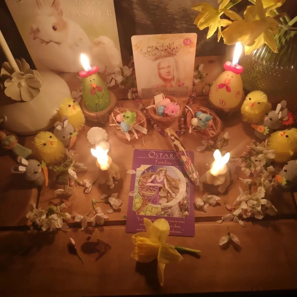 My Ostara altar So, last week, we who follow the modern Celtic-Anglo-Germanic Wheel of the Year with its equinoxes, solstices and four Celtic cross quarterly festivals celebrated Ostara last week. Ostara has always been one of my favourites in the Wheel, and when I was a Christian I always loved Easter. Every year when we were little, my mum would make us these Easter bonnets for school, with daffodils and chicks and pastel eggs all over them. I love the aesthetics and imagery of this time of year, and how we finally emerge fully from the Descent period, ready to climb up the mountain of Summer that reaches its peak at Summer Solstice.