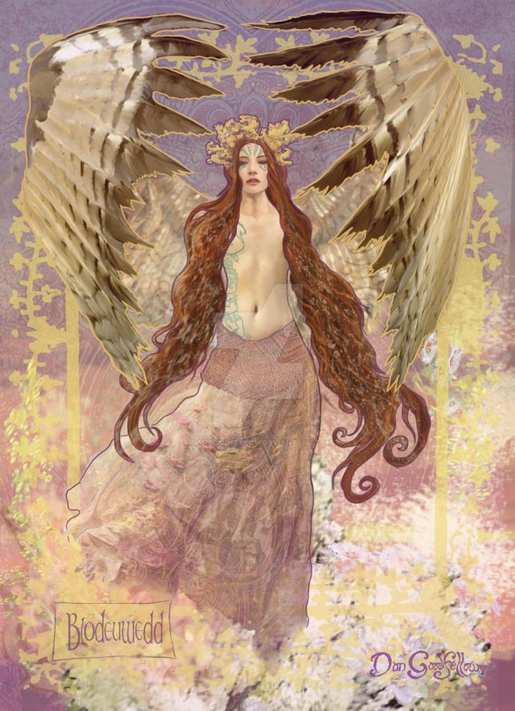 By Judith Shaw from her Celtic Goddess Oracle Card deck I have read her described as being the keeper of the Apple Orchard of the Otherworld, a role that is often given to the god Afallach, his daughter Modron, Morgan le Fay, and various sovereignty goddesses associated with the Otherworld. Given Olwen fits nicely in to this archetypal ‘family’ of Otherworld deities, and her associations with the colour red and love, I can accept this correspondence on the grounds of syncretism and comparative mythology, although I would like to find the source for it and the direct justification. Honestly, a lot of these sovereignty, love, spring and Otherworld goddesses are so similar that it can be hard to discern where one ends and one begins.