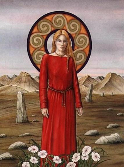 But what makes Olwen so different from the other Flower Brides (other than it being her father and her potential lover who she is the hinge in the love triangle between and not two lovers) is, to me, she seems to have more agency. We do not hear things from her point of view, but she seems to actually be attracted to Culhwch. Culhwch asks for her hand, and she simply says her father won’t allow her to marry, not that she doesn’t want to. Red, to the Welsh Celts, was not, as far as we know, associated with sexuality as it is today, but represented the Otherworld (along with white). When we think of most of the Flower Brides, who many associate with the Maiden aspect of the Goddess, we think of them as wearing white. But Olwen, she wears red. From a contemporary comparative mythology and symbolism perspective, this to me indicates she is ready to become sexually active and enter in to the Lover stage of her life, the transitory period between Maiden and Mother. In the Avalonian tradition of Glastonbury Goddess Temple, Maiden, Mother, Crone is stretched to Maiden, Lover, Mother, Crone, with the Lover archetype representing Beltane (the Maiden instead represents Imbolc, the Mother at Lammas, and the Crone at Samhain). Olwen isn’t a passive figure who has little control over her fate like Creiddylad, or forced in to a marriage she didn’t consent to like Blodeuedd, or married for political reasons like Guinevere/Gwenhwyfar. She seems to actually want to marry, and it’s simply her father holding her back. Not to say that we cannot interpret the aforementioned goddesses as having agency too (the latter two definitely express agency in choosing who to love later on in their stories), but I feel like with Olwen there’s less reclamation that needs to be done. As well as her signature red gown, she is described as wearing many rings upon her fingers, and a necklace of red gold and jewels. She is fully aware of her beauty and sexuality, as opposed to a white-robed, demure, innocent maiden. It’s UPG and modern comparative mythology, sure, but I feel like Olwen is, probably along with Gwenhwyfar, the Flower Bride who is the most aware of her role as passionate Lover. Her red gown such as those worn in depictions of sensual Irish goddesses Áine and Medb, and jewellery worn by the likes of the Nordic love goddess Freya and Mesopotamian love goddess Inanna, tell her father “I’m not a little girl any more, dad.” I think about the way the Glastonbury Avalon tradition depicts Rhiannon, and that’s very close to how I view Olwen. I wonder if parts of Olwen’s energies are being channeled in these more modern depictions of Rhiannon as Lover Goddess.
