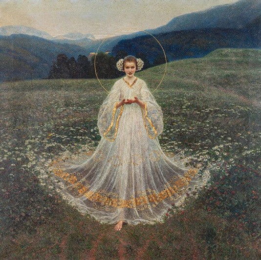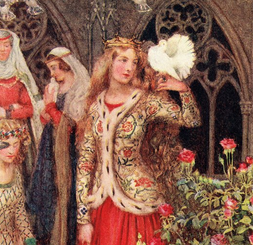 artist unknown In the main text in which she appears, Culhwch and Olwen, she does not appear much in the story because obviously it’s a tale of Manly Knights doing Manly Knight Things, but she is the reason they headed off on their adventure to begin with, as in order to marry her, Culhwch has to go on an epic quest which will prove his worthiness to her father, Ysbaddaden (whose name refers to the hawthorne tree, an obvious link to Beltane), who will die if she marries. Many believe him to represent the old Winter King who does not want to give up his throne, with Olwen as the Flower Bride waiting to be set free from this overprotective paternal figure- one of the oldest examples of stories about fathers who believe no man to be good enough for their daughter, perhaps. This leaves Culhwch as the young, untested Summer Lord who needs the hand of the Flower Bride to begin his reign as Summer King.