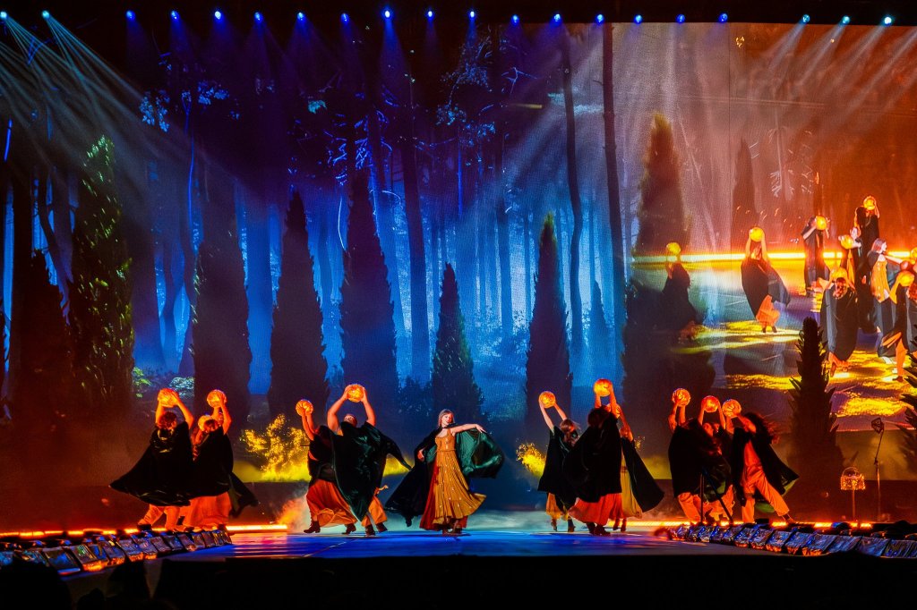 Light the fires, call the dance! She meets her paramour.Dressed in crimson, dressed in white,