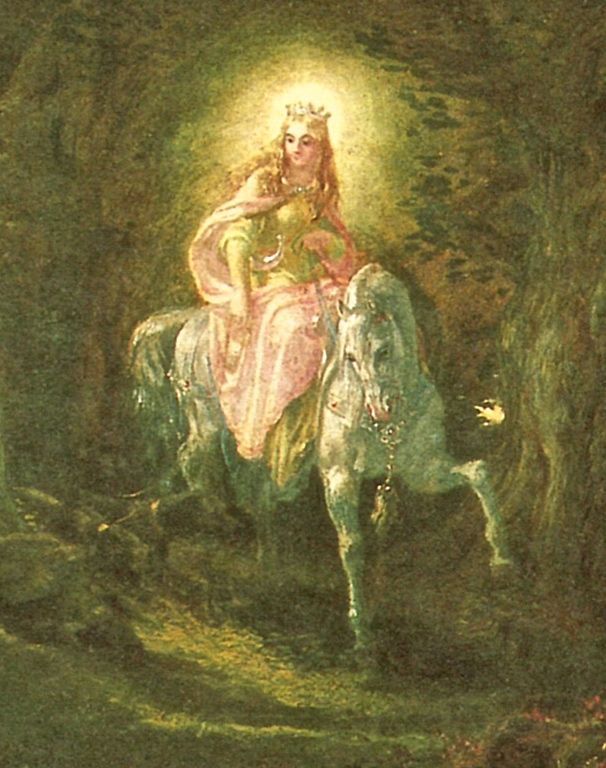 Rhiannon’s story is only one story in our collective Celtic consciousness about the ‘Faery Lover’ or ‘Faery Bride’- a mystical woman, arguably a goddess, who comes out of the mists or the waters or some other liminal faery gateway to take a human man as her lover. Quite the far cry from the timid medieval princess being married off to a stranger for the benefit of her father’s worldly kingdom, the Faery Lover often has agency, and chooses her lover for herself. In many of the stories, she only chooses a man who is already in right-relationship with the land and the world of Faery, and through her divine sexuality that anoints and empowers, he becomes a king. There are different versions of the Faery Lover/Queen/Bride motif, however- sometimes, the Faery Bride does not have much say in the matter, but usually when she is married off against her will, or is mistreated by her human husband, tragedy befalls the man or his kingdom. The Faery Queen/the Sovereignty Goddess will not accept marriage or sexual union with a man she doesn’t choose without putting up a fight. Sometimes, she is the hinge in a love triangle between two men who represent the polarities of Winter/Summer, Old/Young or the Otherworld/This World, and betrays one for the other to represent the changing of the seasons or the ruling order of the realm. Sometimes, she presents her human lover with trials or challenges, which represent the man’s initiation into kingly, divine masculinity. We see this in stories of Courtly Love, where the Lady, such as Guinevere, represents the Faery Lover/Queen. We also see this with Morgan le Fay, who is usually presented as an adversary to Arthur’s knights rather than a lover to most of them, but nevertheless falls into the archetype of the Faery Queen ‘cruelly’ presenting the knight (male initiate) with trials, which ultimately make him into a better, stronger man.