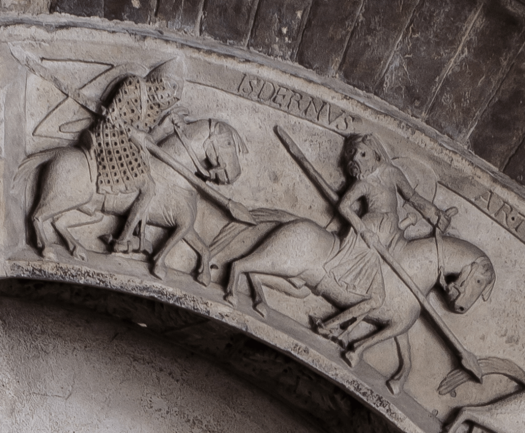 But here’s where it gets interesting. In a cathedral in Italy, Arthur and Edern (as Isdernus) are depicted rescuing Guinevere from a tower, in a motif that parallels the later abduction of Guinevere by Melwas and then Maleagant, in which she is rescued by Lancelot. In an early version of Tristan and Isolde, there is an allusion to Edern being a lover of Guinevere. In the ‘Romance of Yder’, his lover is a ‘Guenloie’, who is likely a split-off version of Guinevere created to keep two traditions alive: Guinevere as the wife of Arthur, and Guinevere as the lover of Edern, without upsetting Christian morality and monogamy norms. In the Modena relief, Edern/Isdernus is not wearing armor, unlike the other knights, which could point to his Otherworldly faery origins, and the fact that in courtly love romances, knights were often depicted as vulnerable before their ladies.