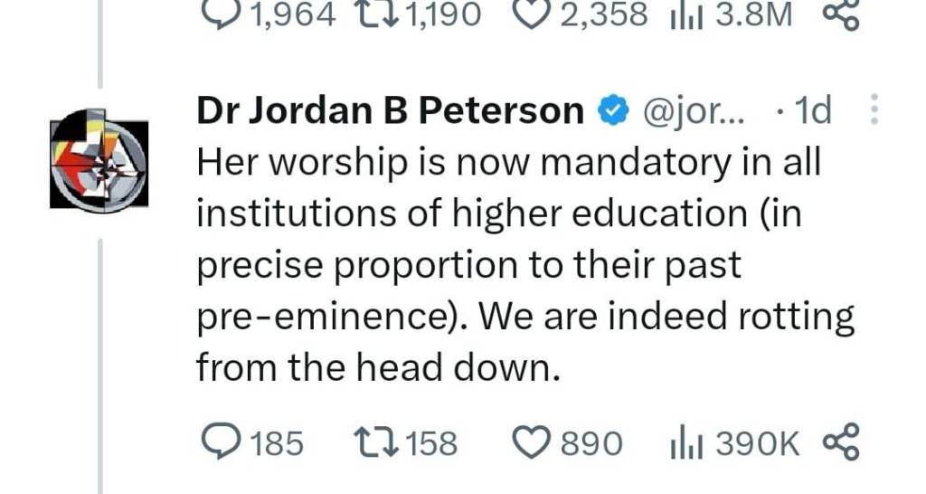 But Kali Maa is not an example of this archetype. As for ‘the Goddess’ in the sense that many modern Westerners use it, She is all, and can be said to contain this archetype within Her, but Christian, and culturally Christian patriarchal men like Peterson hyperfixate on archetypes such as this as if that’s all the Goddess is, implying She is a threat to Western values (when actually Her civilization arguably influenced much of ours). I’m also not sure how he came to the conclusion that the Devouring Mother is influencing academia but I’d genuinely be interested to know why he thinks this. Perhaps he’s saying she prevents professors from allowing students to reach their own conclusions on topics and instead wants them close to her ideas? I’ve heard that about academia before, but to be honest, while the series of tweets seems like mostly incoherent psychobabble to me (as do most of his tweets of late), it seems to be more that he’s associating her with leftist ideologies such as feminism. Which brings me to my final point.